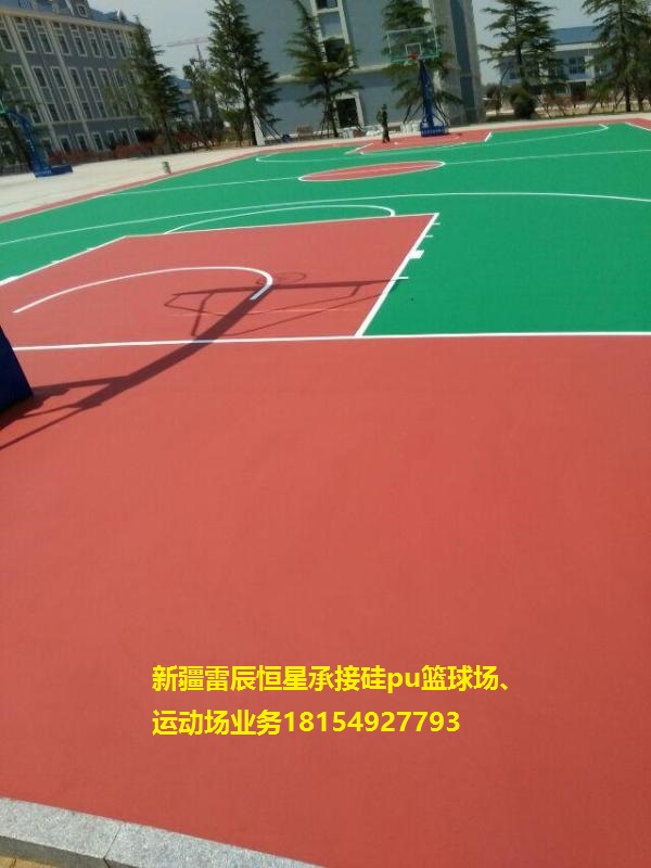 3、面漆層施工:硅PU球場面漆為雙組份材料,由A組份固化劑加上B組份面漆組成,待底層彈性層干固后,將兩種材料混合均勻,然后加入專用石英砂,將材料充分?jǐn)嚢杈鶆蚝笥脻L筒施工。該面漆具有耐磨防滑、耐候性優(yōu)異的性能,并可根據(jù)球場不同的功能區(qū)分出不同的顏色。